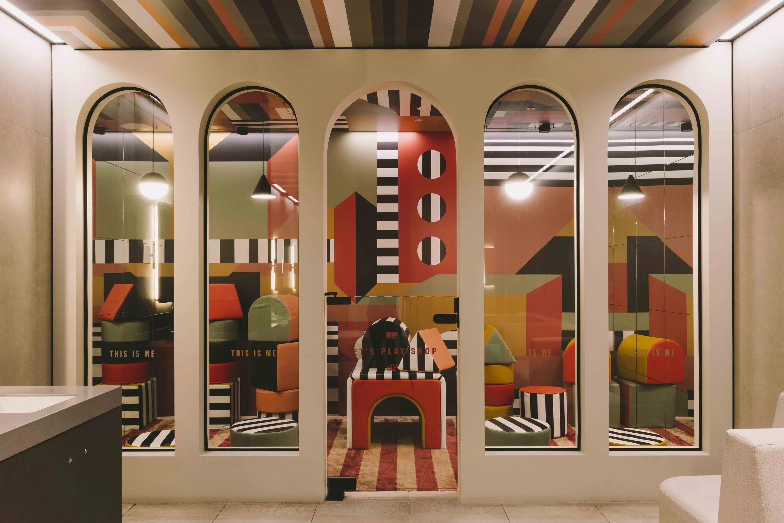 The vibrant and playful children's play area, designed with love and care, features our Bells Junction style carpet in a bold stripe design.